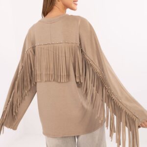 Damska bluza o casualowym charakterze, stworzona z myślą o codziennych stylizacjach. Wykonana z połączenia wiskozy i poliestru, z materiału typu masełko miękkiego, delikatnego i niezwykle przyjemnego w dotyku. Gładka faktura nadaje jej uniwersalności, a standardowa długość i klasyczny, okrągły dekolt sprawiają, że świetnie układa się na sylwetce. Długie rękawy ozdobione zostały frędzlami i ćwiekami, które dodają całości wyrazistego charakteru. Frędzle występują także na plecach, podkreślając oryginalny, nowoczesny styl bluzy. To idealny wybór dla kobiet ceniących wygodę połączoną z modnym detalem.
