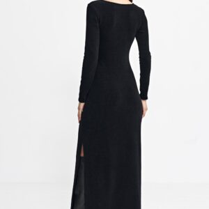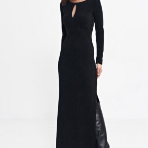 Sukienka o dopasowanym kroju typu fit, wykonana z prążkowanej dzianiny, która podkreśla sylwetkę. Posiada okrągły dekolt z subtelną łezką poniżej, dodającą delikatnego uroku. Odcinana pod biustem, co podkreśla talię, z długimi rękawami, idealnymi na chłodniejsze dni. Długość maxi zapewnia elegancję, a boczne rozcięcie w szwie dodaje swobody ruchu. Wkładana przez głowę, co czyni ją wygodną i praktyczną na co dzień i na specjalne okazje.