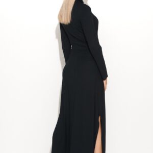 Piękna sukienka wykonana z lekkiej dzianiny wiskozowej, sprawdzi się zarówno w pracy, jak i podczas wytwornego przyjęcia. Sukienka jest długa, dlatego pięknie prezentuje się na wyższej sylwetce. Posiada golf, który z tyłu jest lekko marszczony oraz długie rękawy maskujące ramiona. W dolnej części sukienka posiada dwa rozcięcia, dzięki którym poruszanie się w sukience jest swobodne. Na linii talii obecne jest asymetryczne wiązanie wykonane z tego samego materiału, co cała sukienka. Załóż do niej kozaki, zarzuć na plecy elegancki płaszcz i prezentuj swój styl z dumą.