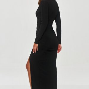 Sukienka na zdjęciu to elegancka, czarna kreacja o dopasowanym kroju, która emanuje klasycznym stylem i wyrafinowaniem. Wykonana z miękkiego, elastycznego materiału, idealnie dopasowuje się do sylwetki, podkreślając jej atuty. Sukienka ma długie rękawy oraz głęboki dekolt w kształcie litery V, co dodaje jej zmysłowego charakteru. Marszczenia umieszczone wzdłuż talii i bioder modelują sylwetkę, nadając jej smukły, kobiecy kształt. Długość sukienki sięga do kostek, a efektowne rozcięcie z przodu odsłania nogę, co dodaje stylizacji subtelnej zmysłowości i elegancji. Lekko bufiaste rękawy wzbogacone o poduszki doskonale podkreślają linię ramion natomiast odcięcie na górze sukienki eksponuje biust. Modelka zestawiła sukienkę z czarnymi botkami na obcasie, co podkreśla elegancki charakter stylizacji, jednocześnie nadając jej nowoczesnego i modnego wyglądu. Całość tworzy idealną propozycję na wieczorne wyjścia, uroczyste okazje lub eleganckie spotkania.