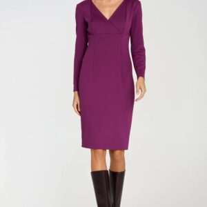 Elegancka sukienka o dopasowanym kroju (fit), wykonana z miękkiej i elastycznej dzianiny, która doskonale układa się na sylwetce. Model z kopertowym dekoltem w kształcie litery V, subtelnie podkreślającym kobiecą linię szyi i dekoltu. Sukienka posiada długie rękawy oraz ołówkową, dopasowaną część dolną, co tworzy klasyczną, ponadczasową sylwetkę. Zapinana z tyłu na kryty zamek umieszczony pośrodku, zapewnia estetyczne wykończenie. Długość do kolan sprawia, że model doskonale sprawdzi się zarówno w stylizacjach do pracy, jak i na wyjątkowe okazje.