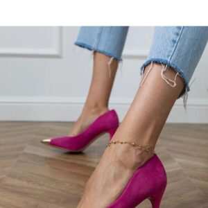 Klasyczne szpilki damskie wykonane z wysokiej jakości zamszowej skóry ekologicznej, które łączą elegancję z nowoczesnym akcentem. Wyjątkowym elementem jest metalowy szpic, nadający butom oryginalnego i wyrazistego charakteru. Model z wysoką szpilką o wysokości 10 cm subtelnie podkreśla sylwetkę, a wkładka ze skóry ekologicznej zapewnia komfort noszenia przez cały dzień. Idealne na specjalne okazje, gdy chcesz wyglądać stylowo i z klasą.