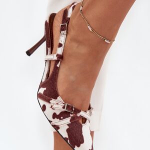 Czółenka damskie z odkrytą piętą, osadzone na szpilce, to doskonała propozycja na wyjątkowe okazje. Z przodu znajdują się dwa przeplatające się paseczki ozdobione małymi klamrami, które dodają im subtelnego uroku. Szpiczaste noski wydłużają nogi, nadając sylwetce smukłości i elegancji. Idealne na wieczorne wyjścia, wesela czy inne uroczystości.